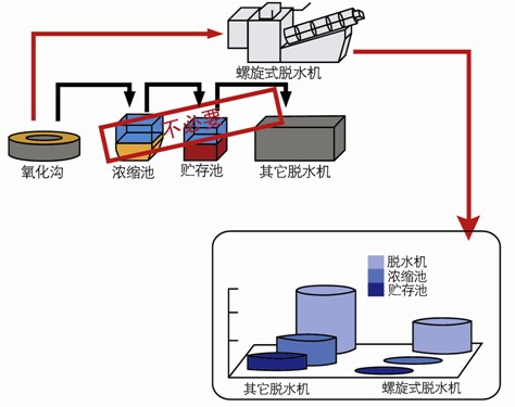 螺旋式污泥脫水機采用的特殊構造使其可直接處理污泥濃度(2000mg/L~35000mg/L)的活性污泥。因而可直接對曝氣池污泥或是沉淀池底部污泥進行脫水操作,不僅可節約污泥濃縮池和污泥儲存池的占地,還可減輕由于污泥儲存時發生的磷釋放和厭氧臭味,并為改進污水處理工藝提供了新思路。