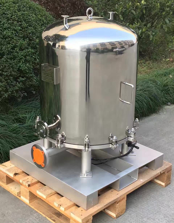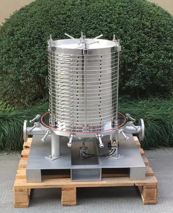 該過(guò)濾機(jī)是在密閉的筒體內(nèi),由若干片水平放置的濾板中間裝夾濾紙組成。它是依靠濾紙作過(guò)濾介質(zhì),在密閉容器內(nèi)進(jìn)行加壓過(guò)濾。過(guò)濾時(shí),濾液由輸送泵送入過(guò)濾體內(nèi),沿著濾板外圈周上的小孔進(jìn)入兩層濾板間,濾液穿過(guò)濾紙和多孔支撐板,流入濾板中心孔道,在機(jī)體底部出料口流出,過(guò)濾精度較高。過(guò)濾完后,用壓縮空氣將過(guò)濾機(jī)內(nèi)殘液.